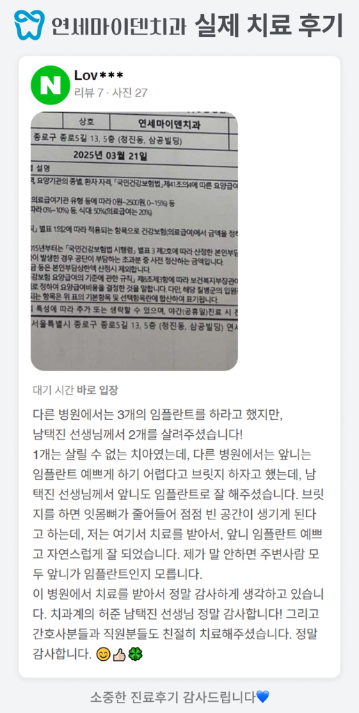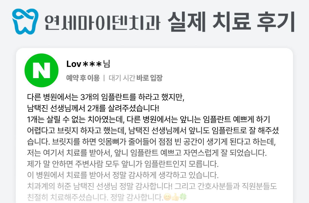 남택진 선생님께서 앞니도 임플란트로 잘 해주셨습니다.