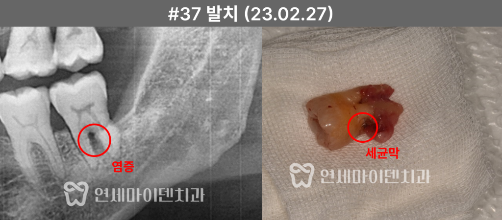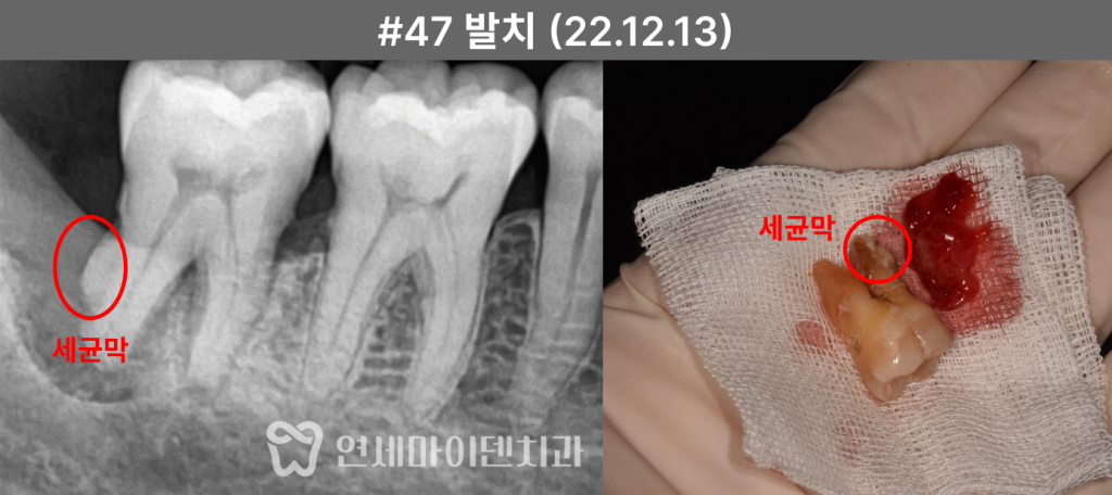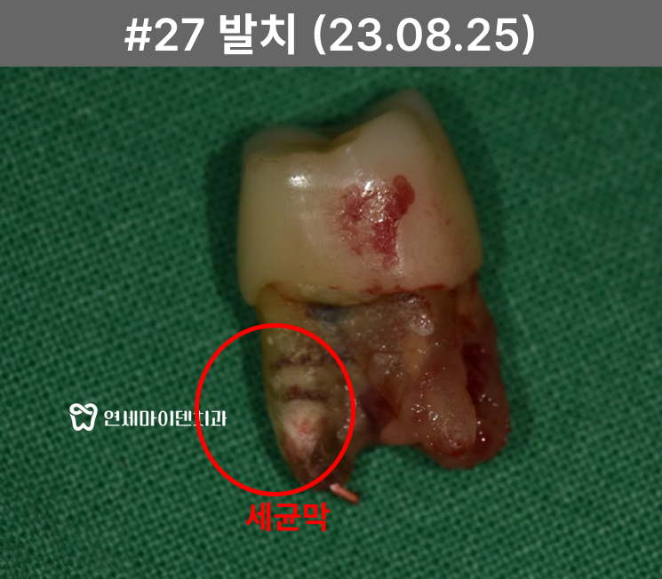 세균막이 치근 전체를 덮고 있어 뼈 재생이 불가능한 상태였습니다.