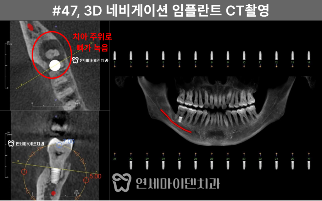 CT 촬영 결과, 치아 후방부의 뼈는 완전히 흡수되어 있었지만