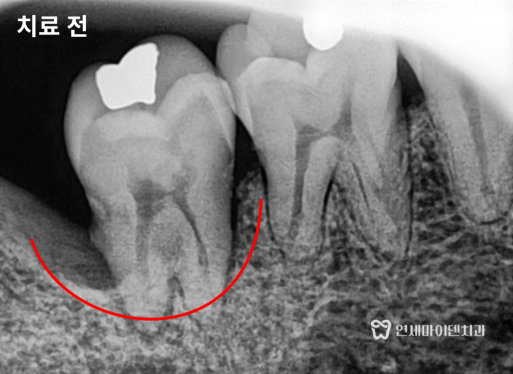치아 뿌리 주변의 치조골이 까맣게 소실돼 있었고,신경관이 바로 인접해 보이는 모습이 관찰되었습니다.