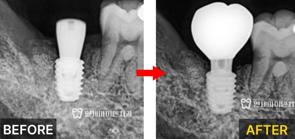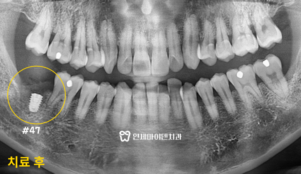 발치 즉시 임플란트 식립을 진행했습니다.뼈가 많이 녹았지만, 연세마이덴치과만의 테크닉으로