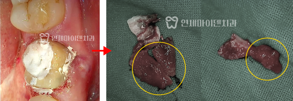 어금니를 반으로 잘라서 뽑아주었습니다.이때 뼈에 부착된 염증 덩어리들이