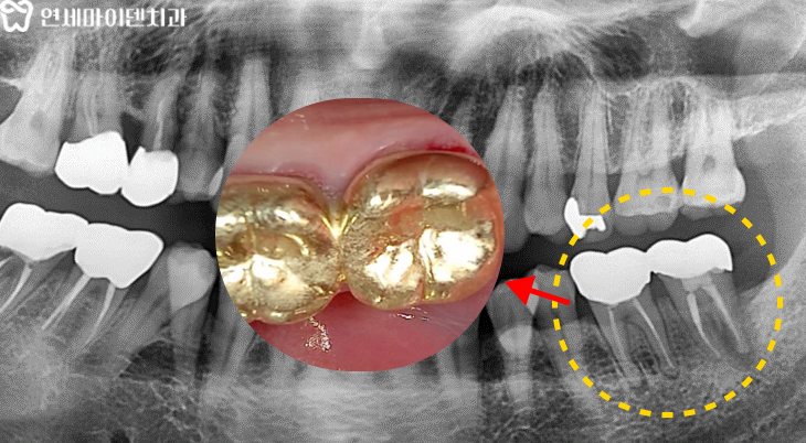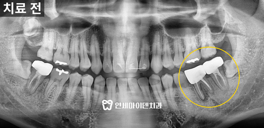 첫 내원 당시, 왼쪽 아래 어금니 2개는 이전 병원에서 신경치료 후