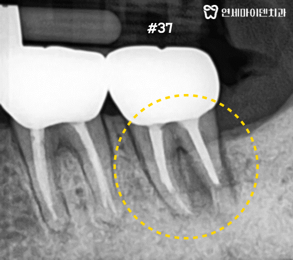 #37번 끝 치아의 뿌리 끝에 염증이 재발한 것을 확인했습니다.치아를 살리기 위해 재신경치료를 시도하지만