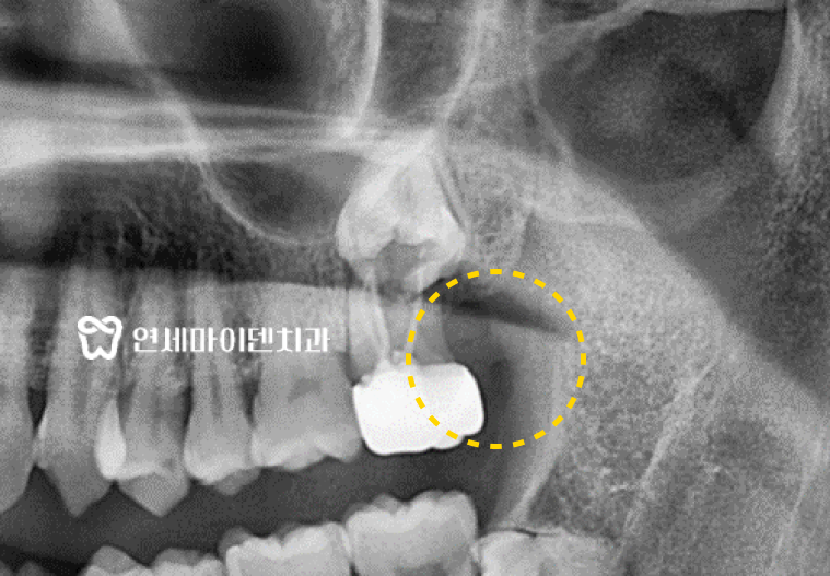 어금니 바로 아래에 매복 사랑니가 있는 것이 보입니다.보통 사랑니는 잇몸 끝쪽에 있지만