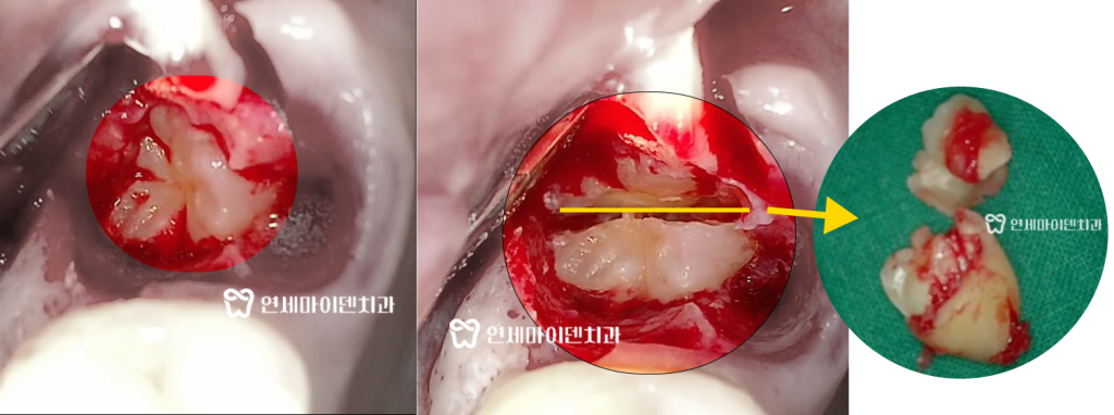 여러 조각으로 쪼갠 후에 발치를 했습니다.매복된 사랑니와 상악동의 거리가 매우 가까웠기 때문에