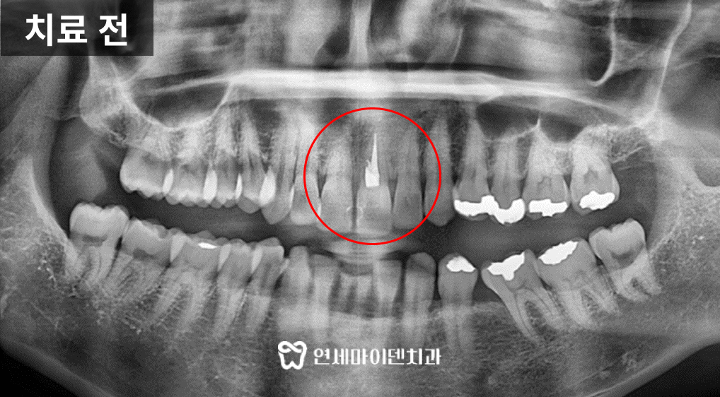 이 환자분은 위쪽 앞니에 불편감이 있어서 신경치료를 했음에도