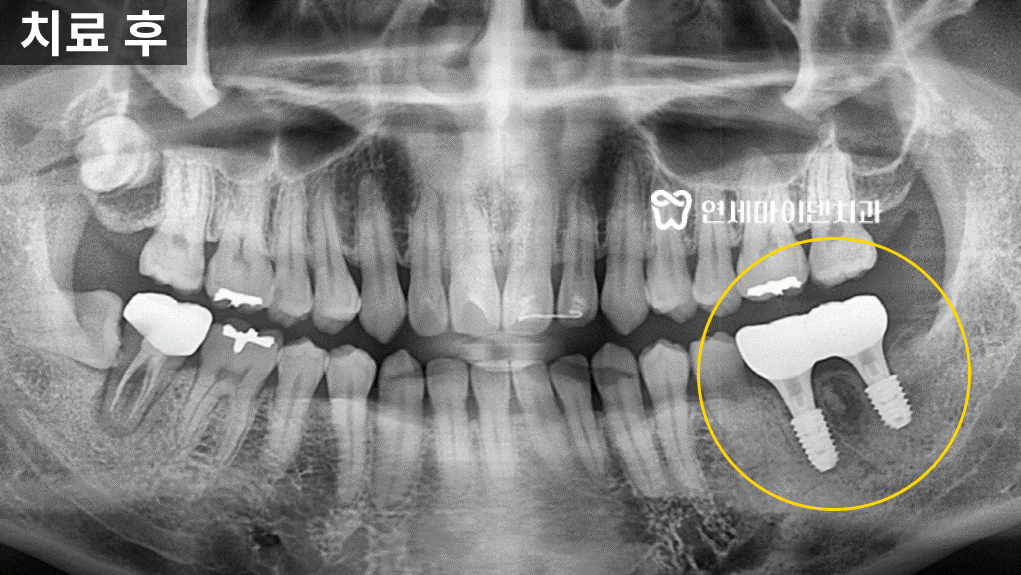 잇몸 뼈가 이미 많이 녹아있는 상태였습니다.고난이도 치료를 많이 시행하고 있는 저희 연세마이덴치과지만