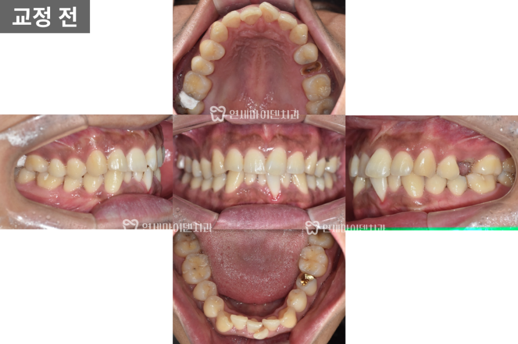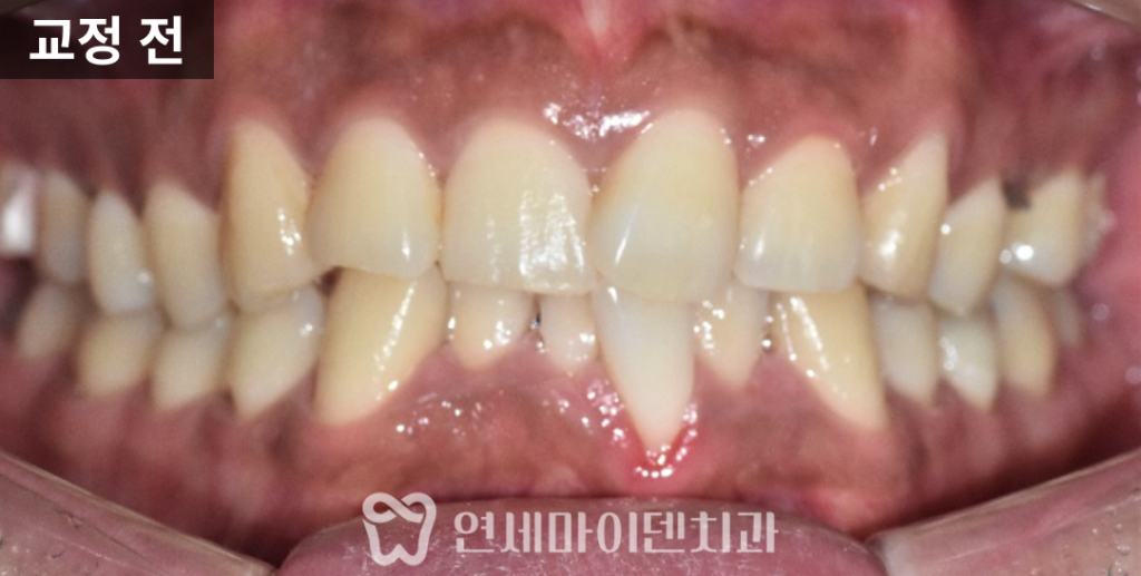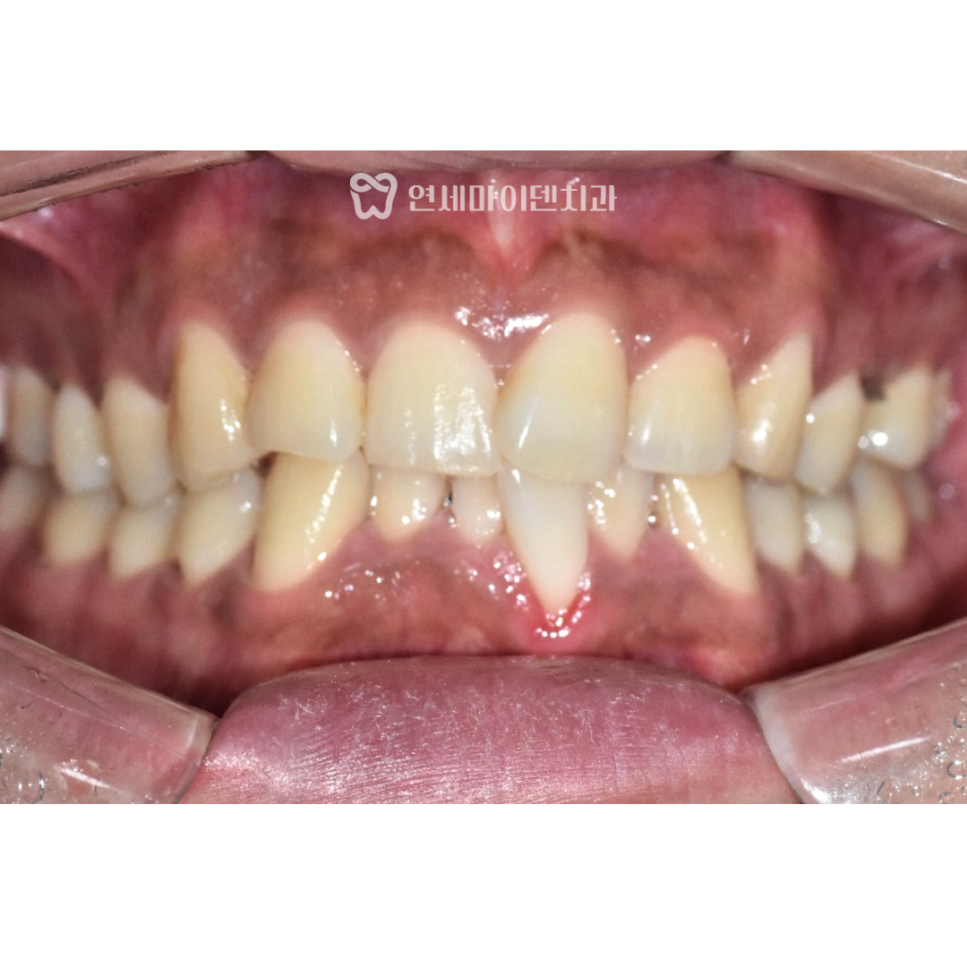 아래 앞니의 겹침이 심했고, 아래쪽 잇몸이 전반적으로 내려가 있어