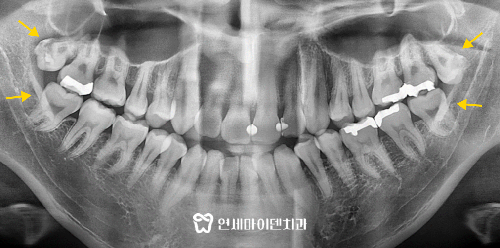 파노라마 방사선 촬영으로 구내 상태를 더 면밀히 확인해보면,