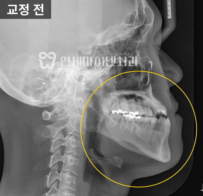 치료 전 사진을 보면, 오른쪽으로 아래턱 틀어짐이 보이고,