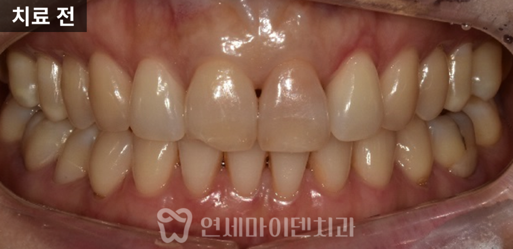 치료 전 변색되어 어두웠던 앞니는