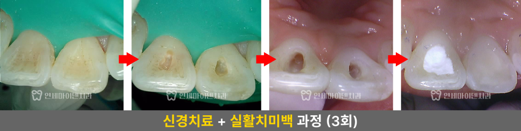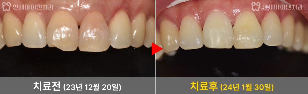 석회회로 변색된 앞니 실활치 미백 전후 비교