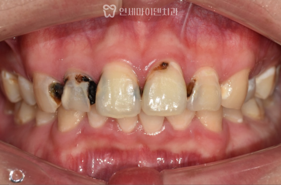 위쪽 앞니 4개에 다소 심한 충치가 진행된 상황이었습니다.